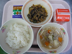 ごはん、豚汁、ナスの肉みそ炒め、ふりかけ、牛乳
