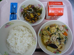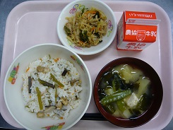 山菜ごはん、えんどうのみそ汁、切り干しのピリ辛炒め、牛乳