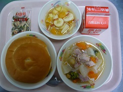 ミルクロール、ポトフ、フルーツポンチ、ナッツと小魚、牛乳
