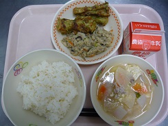 ごはん、竹輪の磯辺揚げ、卯の花炒り煮、豚汁、牛乳