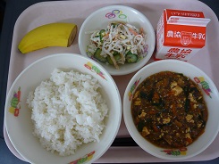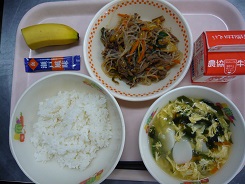 ごはん、トック、チャプチェ、ふりかけ、バナナ、牛乳