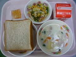 胚芽食パン、クリームシチュー、コーンソテー、ジャム、牛乳