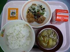 ごはん、とりのから揚げ、磯香和え、もぞこ汁、ふりかけ、牛乳