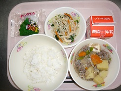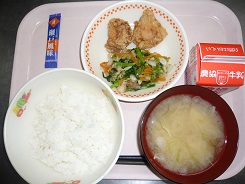 ごはん、とりのから揚げ、おかか和え、つるも汁、ふりかけ、牛乳
