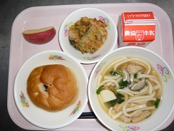 豆パン、五目うどん、野菜かき揚げ、りんご、牛乳