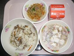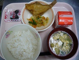 ごはん、赤カレイのから揚げ、野菜ソテー、かきたま汁、ごぼうこんぶ、牛乳