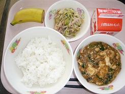 ごはん、牛乳、麻婆豆腐、もやしナムル、バナナ、牛乳