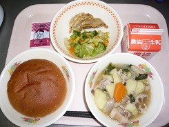胚芽パン、オイスターソース煮、ギョウザ、コーンソテー、クリーム、牛乳