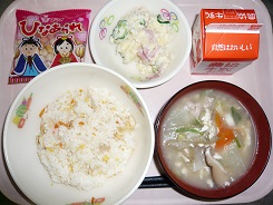 梅ごはん、酢豚、千切りスープ、ヨーグルト、牛乳