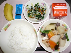 ごはん、含め煮、磯香和え、のりの佃煮、バナナ、牛乳