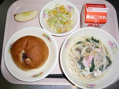 豆パン、五目うどん、ツナサラダ、りんご、牛乳