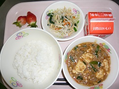 ごはん、麻婆豆腐、五目なます、いちご、牛乳