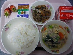 ごはん、卵とじ、五目きんぴら、ふりかけ、いちご、牛乳