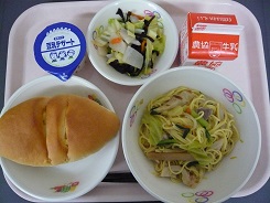 チーズパン、焼きラーメン、かぶ和え、豆乳デザート、牛乳