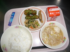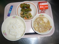ごはん、とり野菜、ちくわの磯辺揚げ、切り干し大根のピリ辛炒め、ふりかけ、牛乳