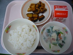 ごはん、イカのカリン揚げ、揚げかぼちゃ、飛鳥汁、牛乳