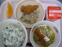 わかめごはん、チキンカツ、卯の花炒り煮、みそ汁、オレンジ、牛乳