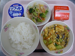 ごはん、とうふのカレー煮、ごま和え、ヨーグルト、牛乳
