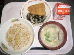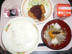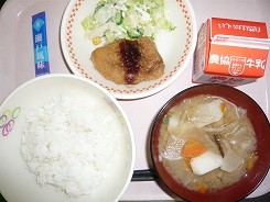 ごはん、牛乳、トンカツ、キャベツサラダ、のっぺい汁、ごぼう昆布