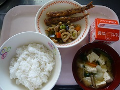 ごはん、メギスのいしる揚げ、五目豆、みそ汁、牛乳