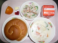 ミルクロール、牛乳、クリームシチュー、カミカミサラダ、ジャムマーガリン、柿