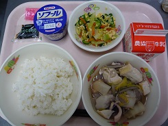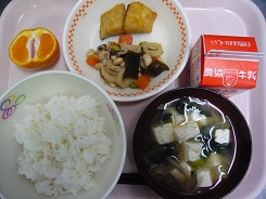 ごはん、牛乳、鰆のから揚げ、五目豆、みそ汁、みかん