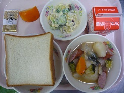 ミルク食パン、牛乳、ポトフ、おさつサラダ、柿、ピナッツクリーム