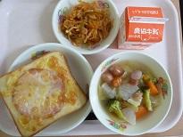 クロックムッシュは、厚切りのミルク食パンに、給食室で作ったホワイトソースをまんべんなく塗り、ロースハムをのせ、とろけるチーズを散らしてオーブンで焼きました