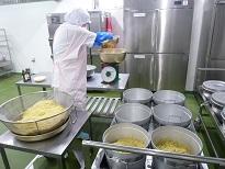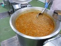 ミートソースはたっぷりの玉ねぎからの水分で、水は一滴も使わず作り、大食缶に配缶しました。麺は二釜に分けて茹でて、オリーブオイルとパセリを回しかけてミニ食缶に配缶しました。