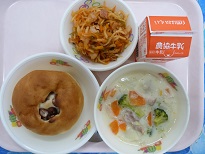 豆パンには金時豆の甘煮が入っています。子どもたちの中には、豆パンが苦手という子もいるので、豆の効能を知って食べてもらうため、今日の健康委員会の給食ひとくちメモの放送は、金時豆についてのお話にしました
