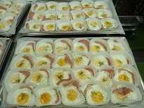 カップを並べて、半月切りのハムを敷き、お椀に割りいれた卵をそっと入れますスチームコンベクションで蒸して、塩とパセリを振って出来上がりです油は使わないハムエッグなので、ヘルシーです