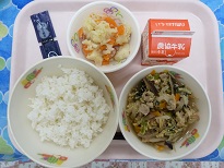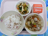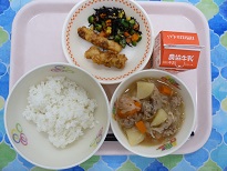 柳川鍋は、本来はどじょうで作るそうですが、給食では、豚肉、ごぼう、しいたけなどをしょうゆ味で煮て、卵でとじた柳川風煮として出しています