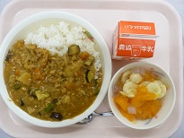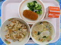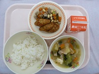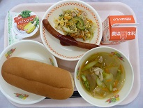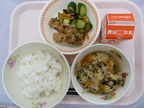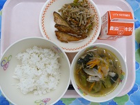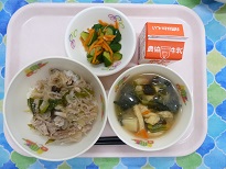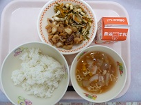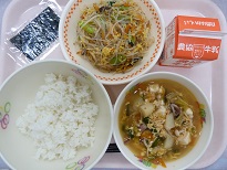 チャプチェは春雨、牛ひき肉、椎茸、錦糸卵、たけのこ、小松菜、にんじんを炒め、しょうゆ、さとう、酒、ごま油、コチュジャン少々で味付けしましたキムチの入った具だくさんのスープには、先日の地場産物給食で使ったスルメイカのゲソを冷凍してあったものを入れたので、海の香りもして美味しかったです