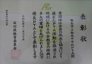 輪島中PTAが優良PTAとして「いしかわ教育功労者表彰」を、