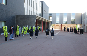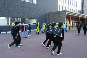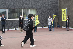 剣道部とサイエンス部親子による挨拶運動が行われ、