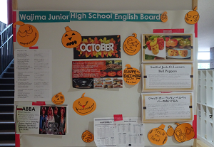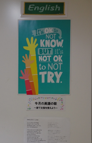 英語掲示板の設置や、今月の「英語歌」の掲示など、