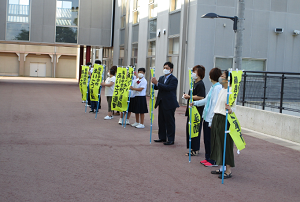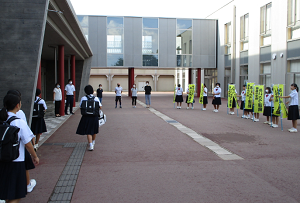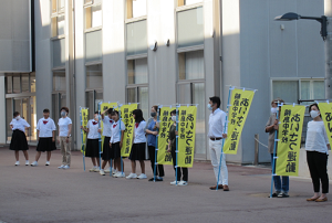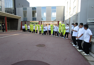 2020年9月23日 11時36分今日(23日)の挨拶運動の担当は水泳部と柔道部。