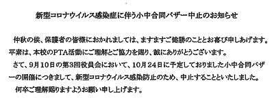 本日、PTA会長と企画委員長の連名で中止のお知らせを配付しました。