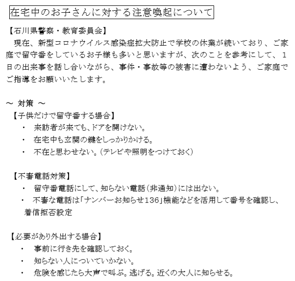 2020年4月17日 17時28分石川県警察及び教育委員会より、