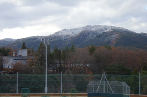 校舎から見える紅葉の山々が白く色づき、