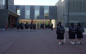 生徒たちは葉っぱの絨毯の上を登校しています。
