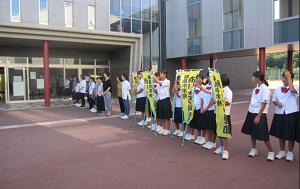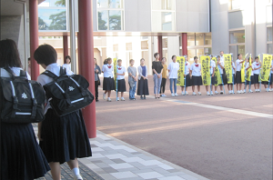 今日は女子ソフトテニス部の親子挨拶運動。