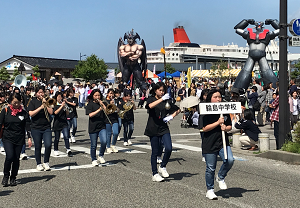 倭の島大パレードでは、吹奏楽部が堂々と練り歩きました。