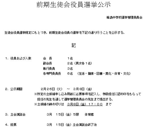 26日、平成31年度前期の生徒会役員選挙が公示され、