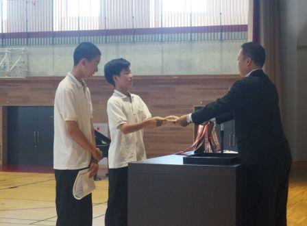 全校集会では県体納賞と成績優秀者表彰を行いました。