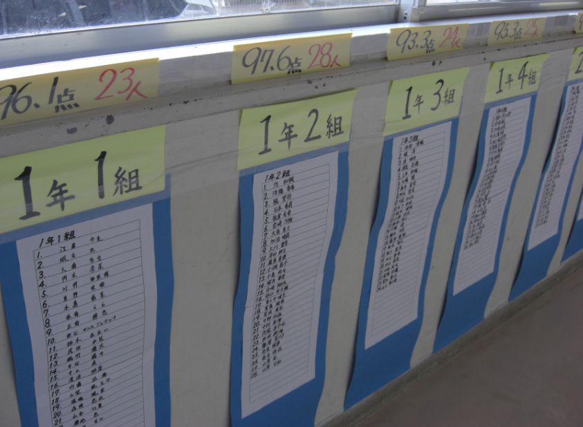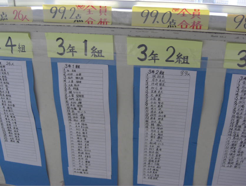 学級毎に合格者(97点以上)の氏名が載っています。