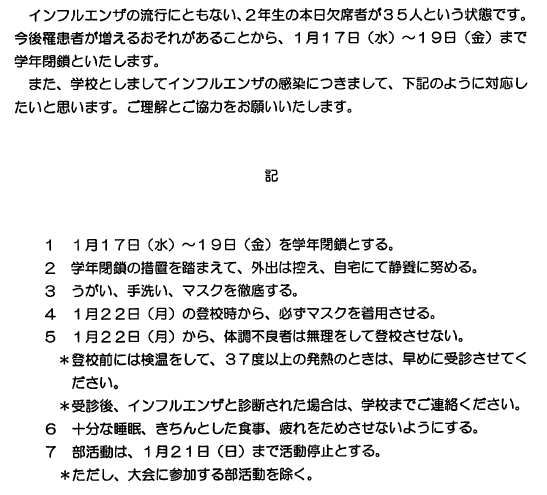 2年生にインフルエンザが流行しています。