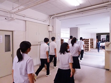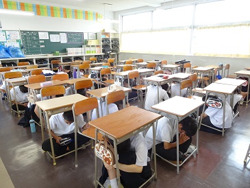 サイレンの指示に従い、窓やカーテンを閉めて待避行動を取った後、体育館に集合しました。