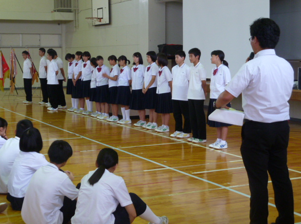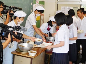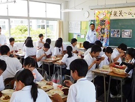 生徒達の給食準備の様子を見ていただいた後、学校給食についての栄養士の話を聞きながら、給食を試食していただきました。