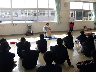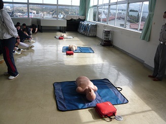 輪島消防署の方に来て頂いて、胸部圧迫の仕方やAED(自動体外式除細動機)の使い方について教えてもらいました。
